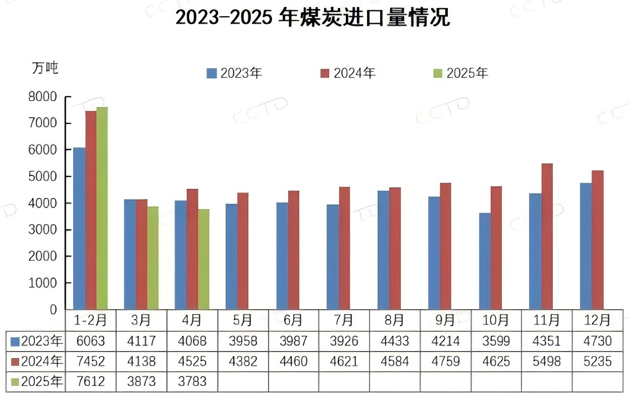 根据国家海关总署最新公布的数据显示,2025年4月份,我国进口煤炭3782.5万吨,较去年同期的4525.2万吨减少742.7万吨,同比减少16.4%;较今年3月份的3873.2万吨减少90.7万吨,环比减少2.